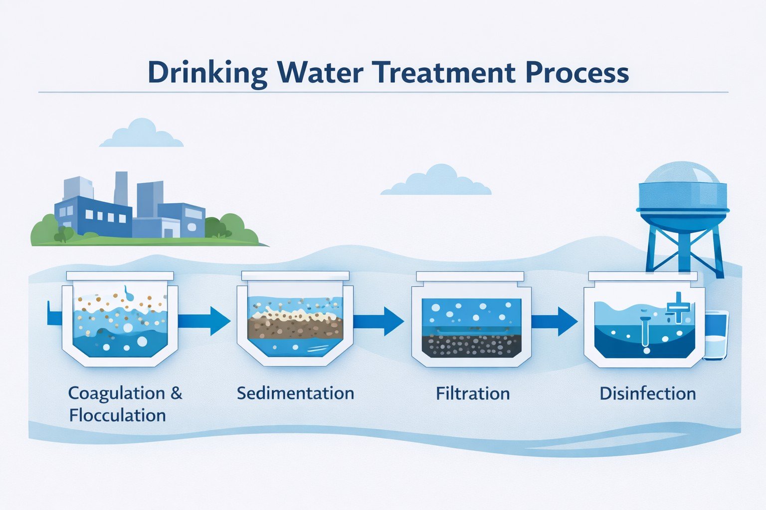 Drinking water treatment is the process used to make raw water safe for human consumption. Water is typically sourced from rivers, lakes, reservoirs, or groundwater wells and must go through several treatment steps before reaching homes and businesses.