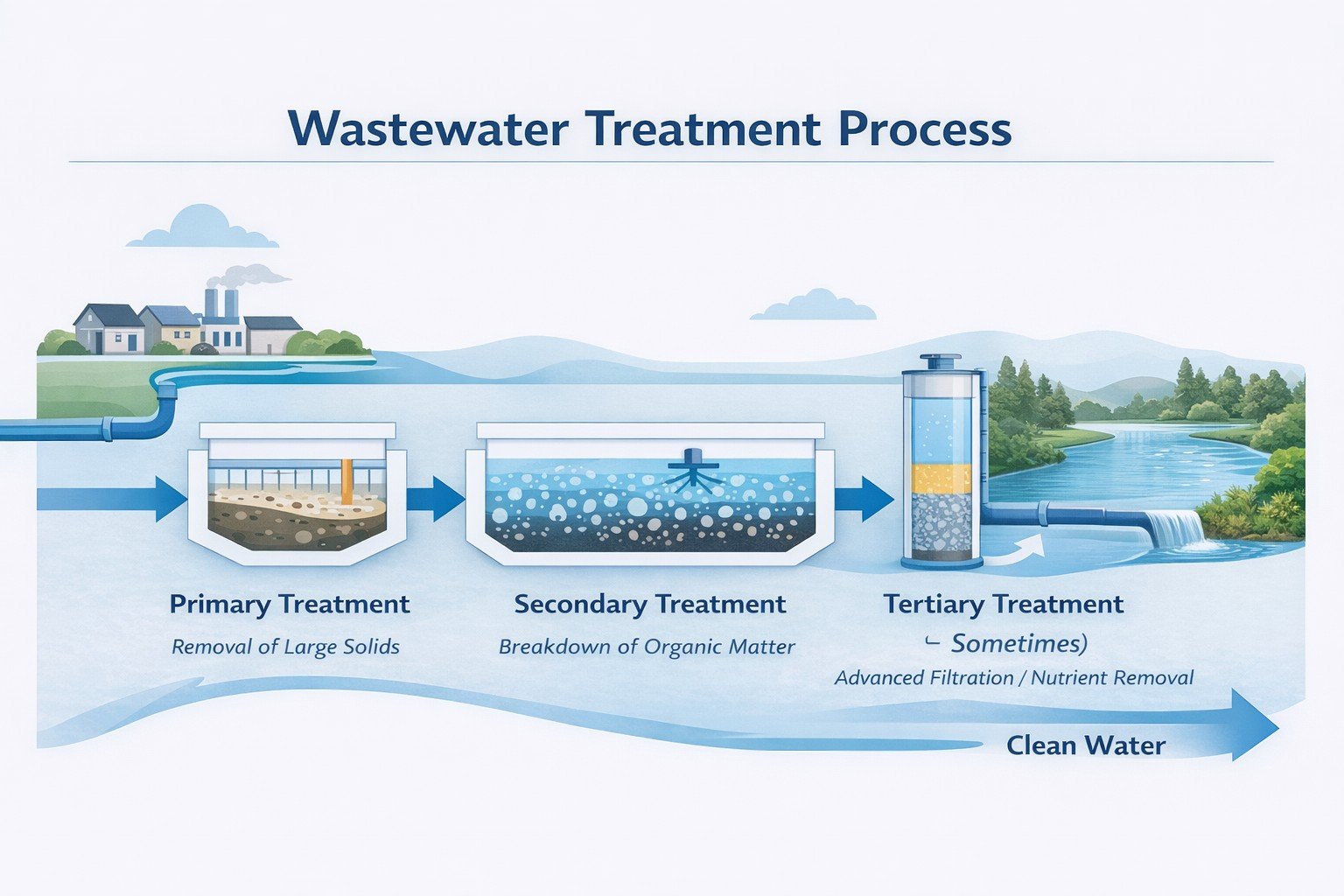 The process typically includes primary treatment (removal of large solids), secondary treatment (biological processes that break down organic matter), and sometimes tertiary treatment (advanced filtration or nutrient removal). Treated water must meet permit standards before being released into rivers or lakes.